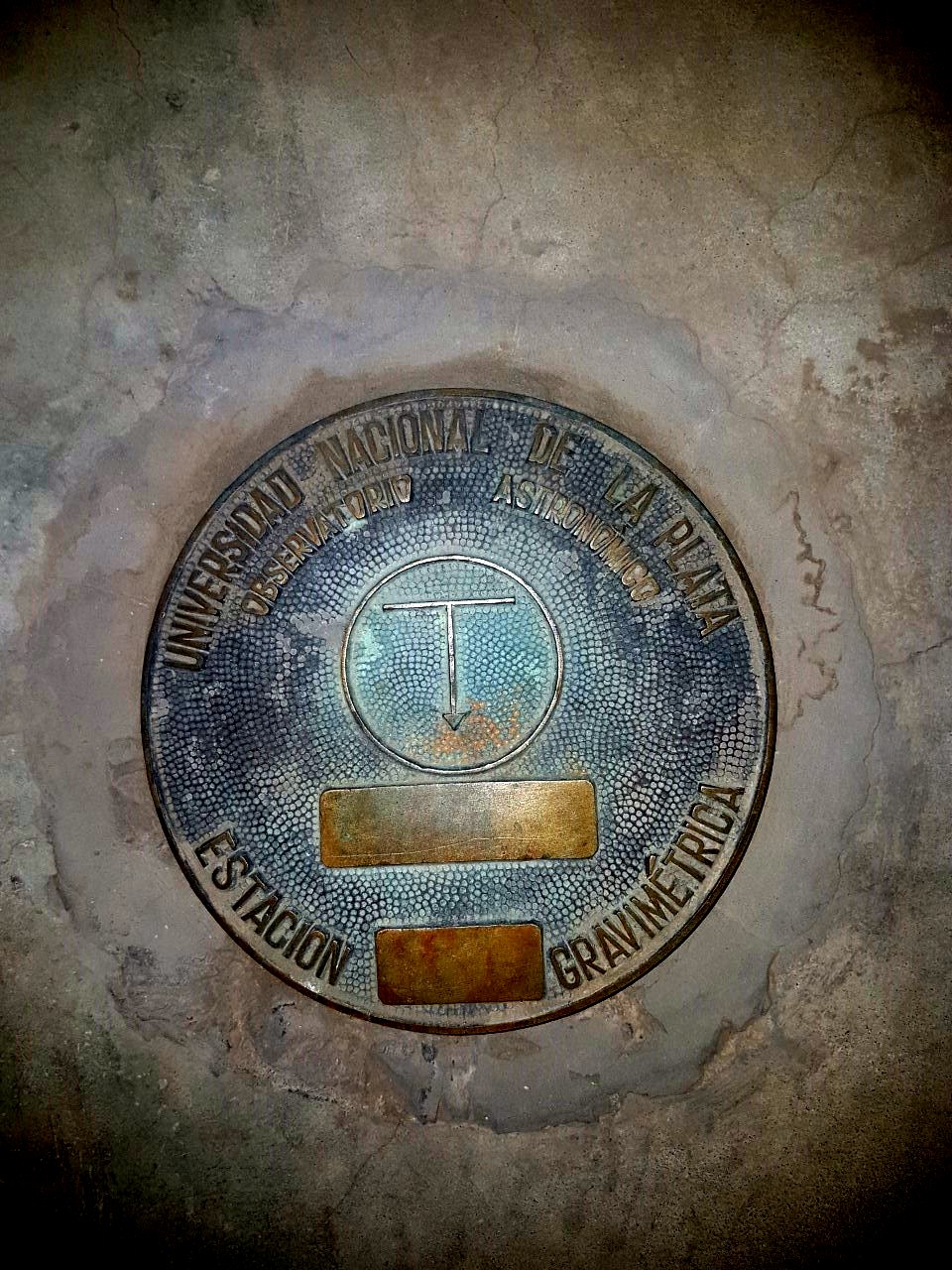 ̶ Ahí está, ̶ me dijo señalando al suelo. Era un redondel de metal, de unos 25 centímetros de diámetro, empotrada en el piso. Con ayuda de una linterna leí las inscripciones de la placa y le trasmití al Dany: ̶ dice . . . Observatorio Astronómico . . . La Plata . . . Gravimétrico . . . – un poco leyendo y otro poco adivinando